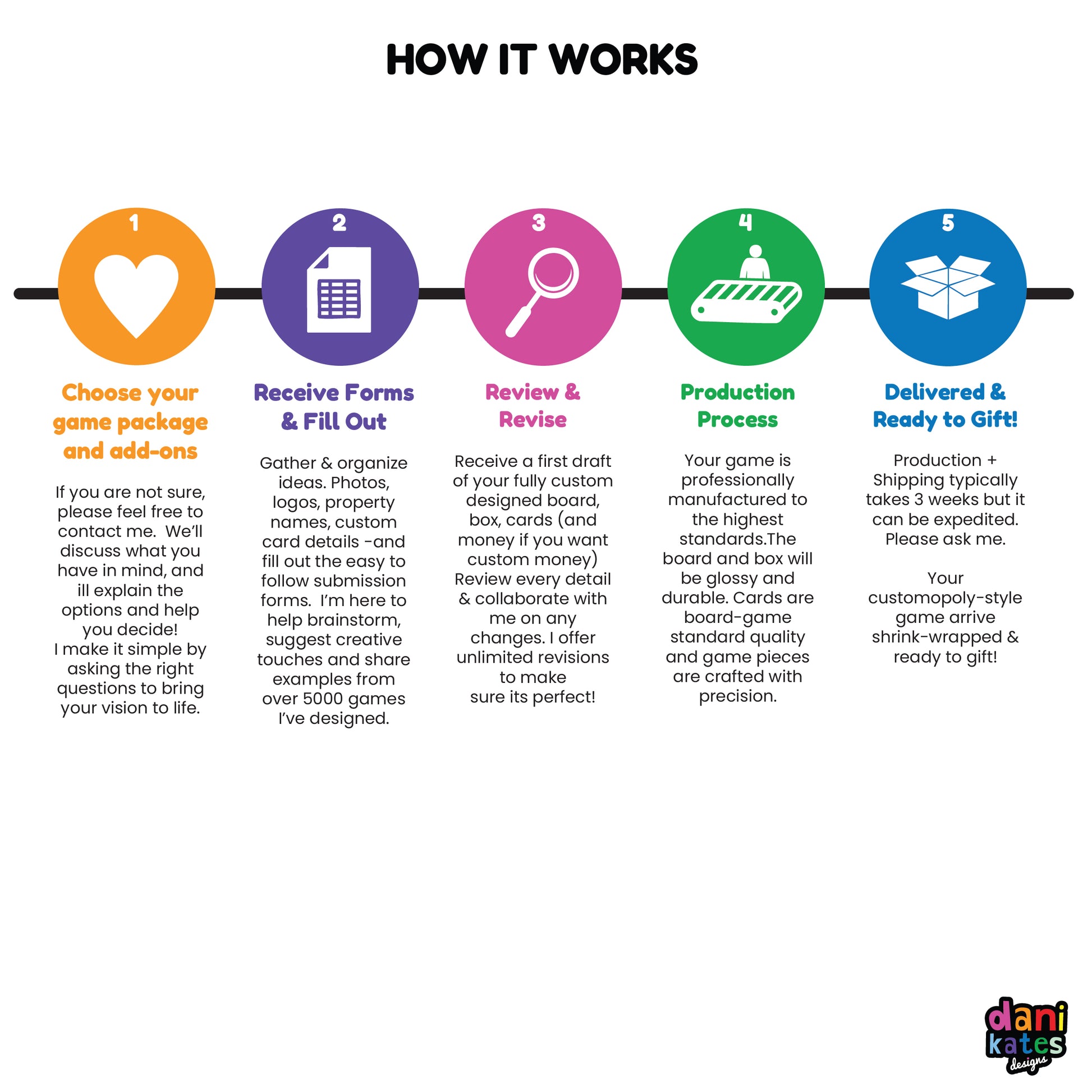 - 11 Custom Images (4 railroads, 2 taxes, 2 utilities, Go To Jail, In Jail and Free Parking) *Custom images can be your photos or our custom clip-art style illustrations